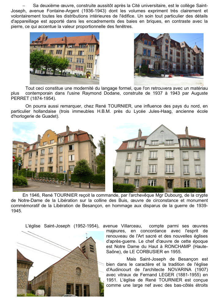 Permettez-moi de m’attarder plus largement, pour rendre hommage, à cet ancien confrère que j’ai bien connu, ainsi que l’un de ses fils, Jacques, également architecte. Alors que j’étais moi-même étudiant architecte à Besançon, René TOURNIER était directeur de l’École des Beaux-arts de notre ville, de 1947 à 1955.- Sa première œuvre, la Cité universitaire (1929-1936), exprime un volume marqué d’influence flamande et Arts décoratifs, tout en restant un langage formel qui lui est personnel et