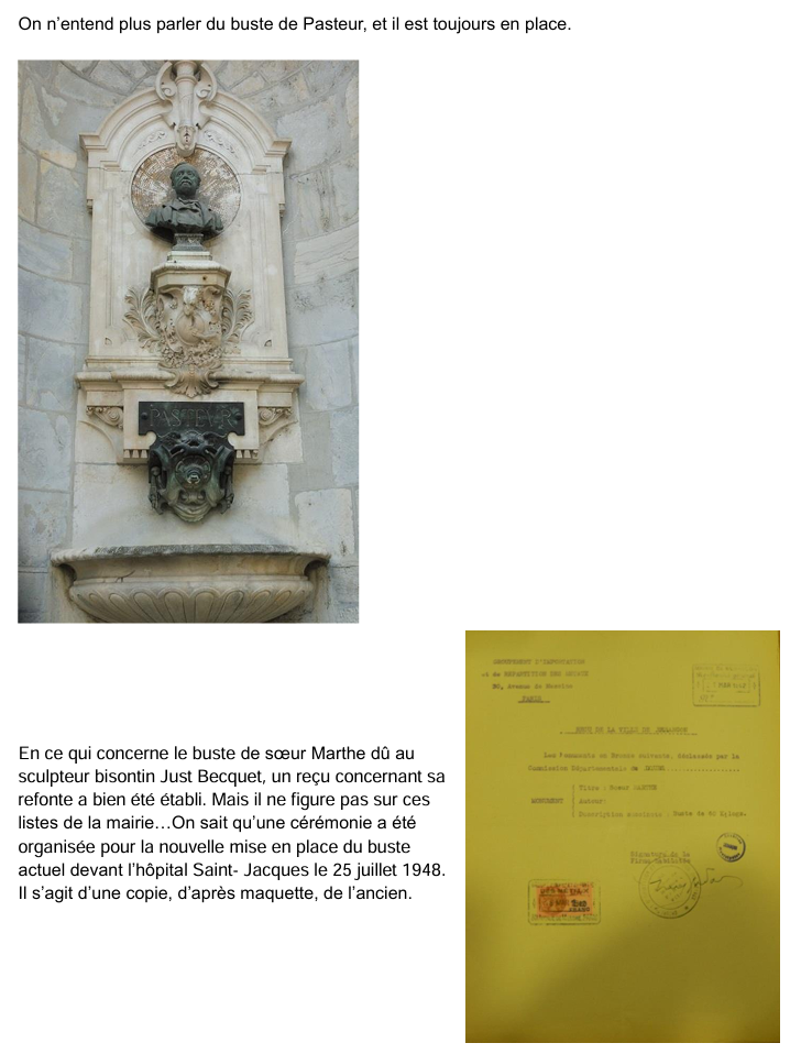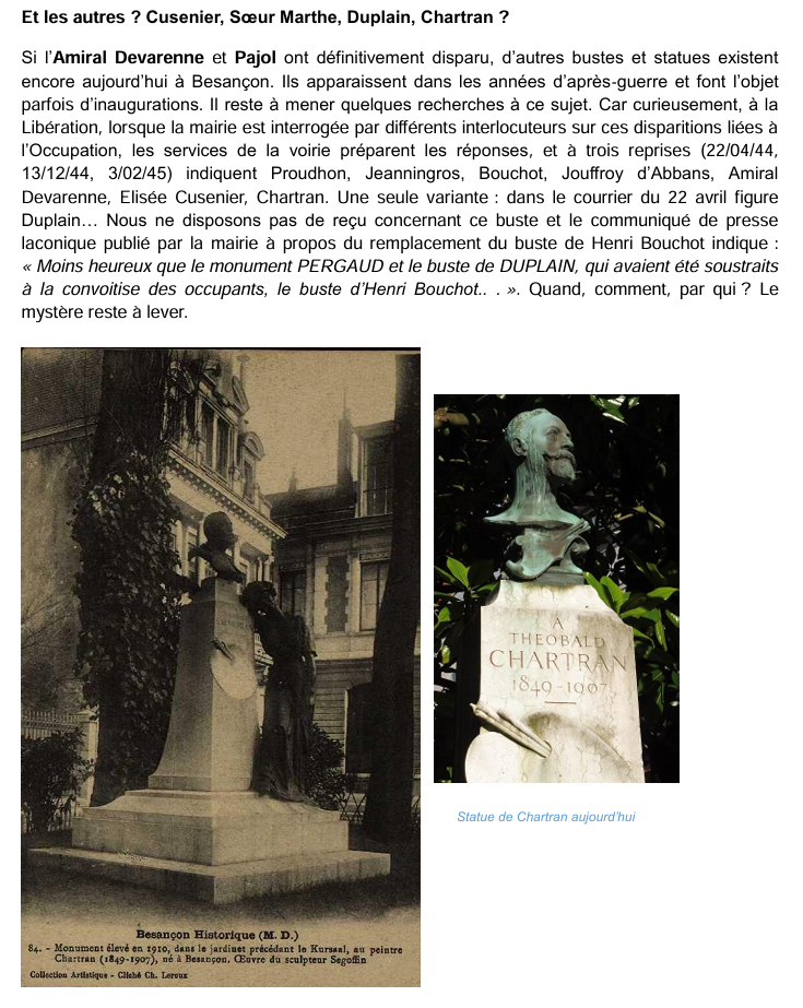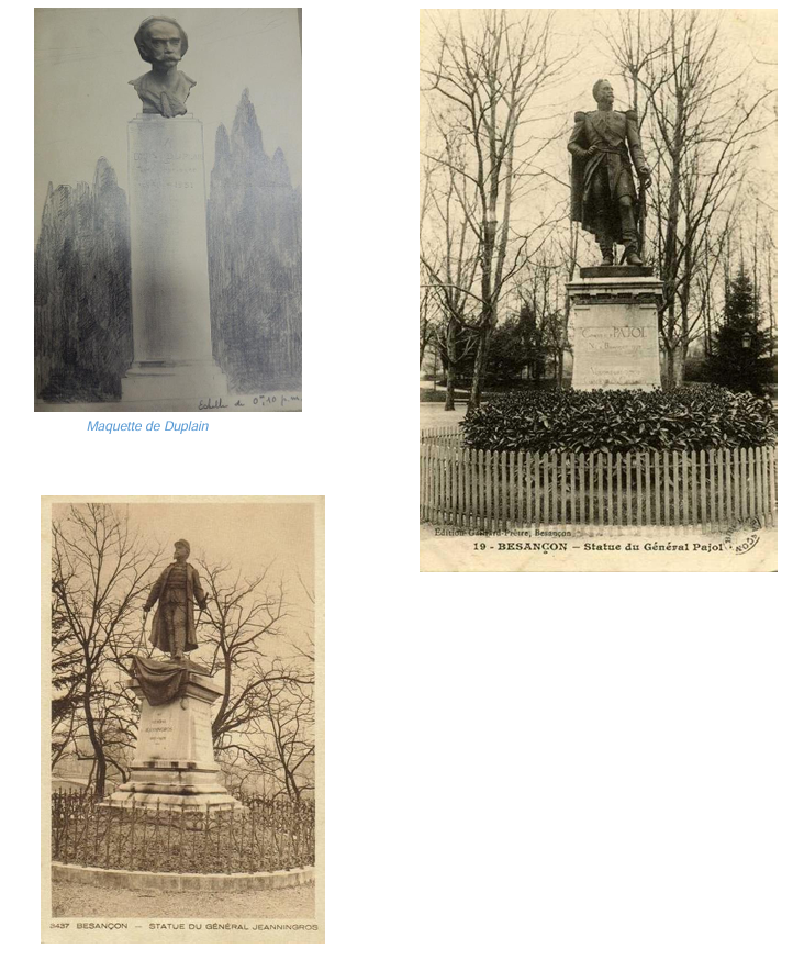 Les monuments du Général PAJOL (Chamars), de CHARTRAN (Granvelle), de l’AMIRAL de VARENNE (Square Saint-Amour), du GENERAL JEANNINGROS (avenue d’Helvétie), de PROUDHON (rond-point des Bains), de CUSENIER (square Cusenier) ainsi que la FONTAINE du SQUARE SAINT-AMOUR et les FONTAINES WALLACE de Granvelle et Micaud ont été considérés comme devant être livrés à la fonte.