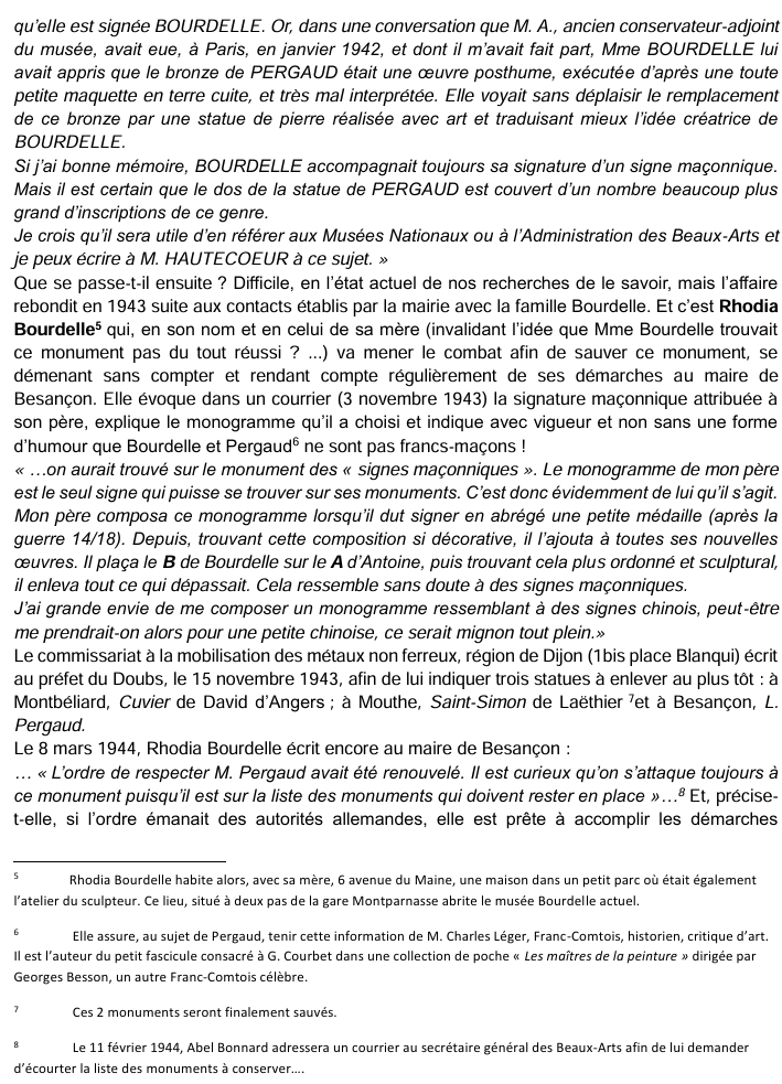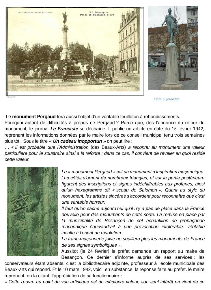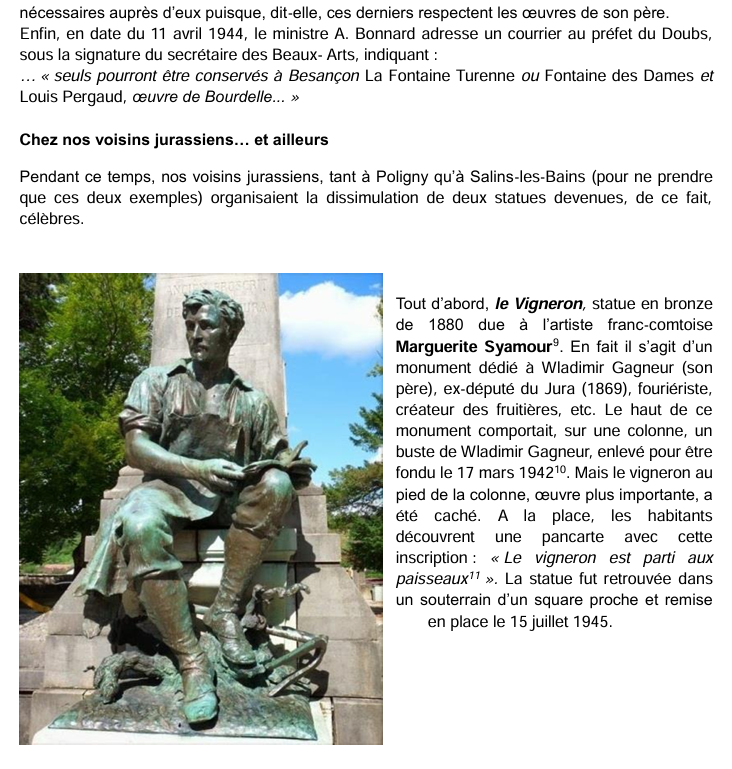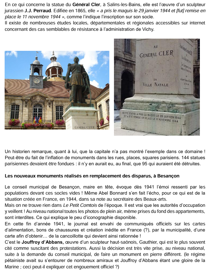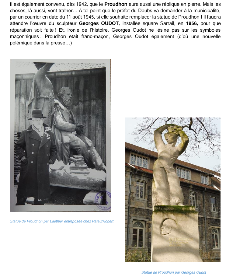 « notifie à la ville la décision du comité institué au secrétariat des Beaux-Arts d’enlever non seulement les monuments condamnés par la commission mais également tous ceux dont elle demandait la conservation ou le remplacement ». Le maire a beau protester auprès du secrétariat général, puis auprès du préfet « en insistant surtout sur l’effet produit dans la population par l’enlèvement de Jouffroy », dans un premier temps le seul résultat obtenu est l’autorisation de remplacer JOUFFROY, PROUDHON et PERGAUD par des répliques en pierre. Décision datant de fin décembre 1941.
