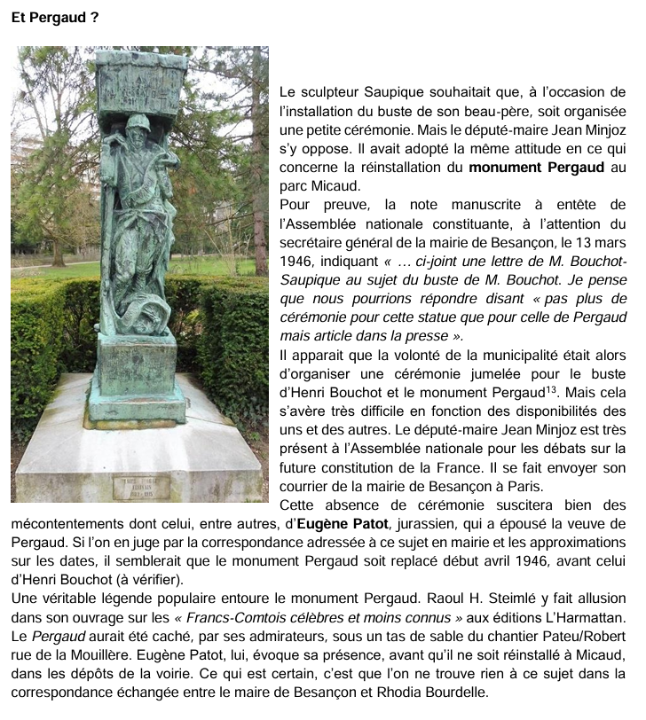(13) ironie de l’histoire, c’est la même fonctionnaire qui, après avoir rendu en 1942 le rapport au maire indiqué plus haut, sera chargée de tenter d’organiser la cérémonie de réinstallation de Pergaud … .