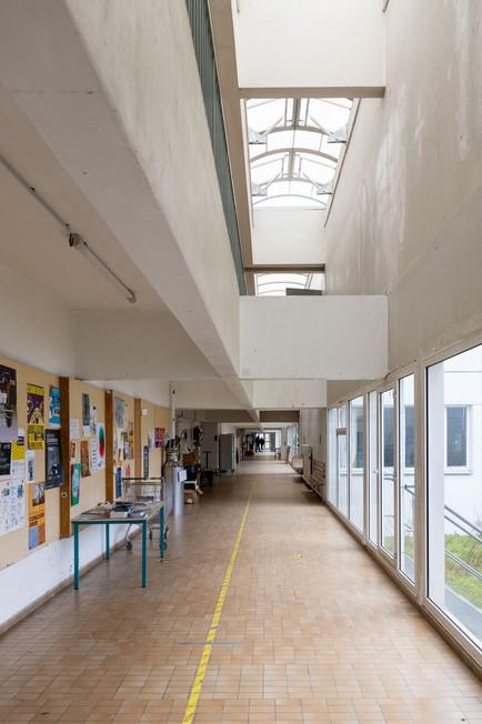 « L’ensemble, construit en béton, est agencé autour de patios et de courettes. Les différents bâtiments abritent des ateliers et des salles de cours pour les sections d’enseignement, un laboratoire photographique, deux amphithéâtres, une bibliothèque, des bureaux et le logement du directeur. L’entrée de l’école sous un auvent, donne accès à une cour qui distribue les différentes fonctions. Le grand amphithéâtre polygonal de 250 places ferme cette cour à l’ouest. A l’est les ateliers collectifs et les salles de cours sont distribués par une rue intérieure sur deux niveaux couverte d’une verrière. Elle est rythmée par la succession des trois patios. Les courettes donnant sur l’extérieur séparent les ateliers conçus comme des volumes indépendants, ils sont toutefois reliés au reste de l’école par des circulations secondaires. Les bâtiments sont éclairés par des toits en sheds, ainsi que par des baies sur les patios et le parc extérieur. Ces ouvertures sont habillés de brise-soleils en béton préfabriqué »
